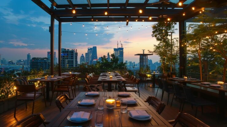 Relax under the open sky with pleasant lighting, music and a calm evening atmosphere.
